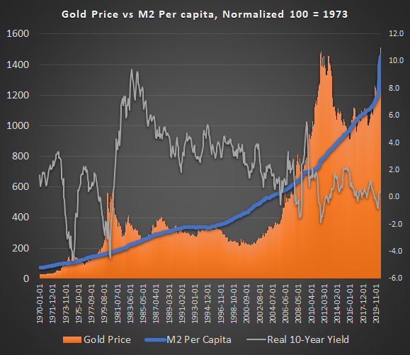 In fact, if we look at that previous gold-vs-M2-per-capita chart again, but add the inflation-adjusted interest rate of the 10-year U.S. Treasury to the chart on the right axis, we can see that those spikes in the gold price above the trend line happened during plunges to low real interest rates: