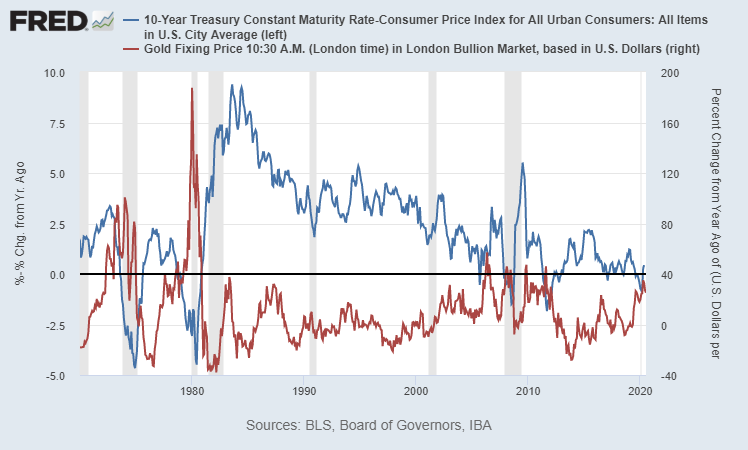 I’m long gold in part because I expect bank yields and Treasury yields to pay interest rates that are below the prevailing inflation rate for a while. Of course, during deflationary shocks we can get a quarter or two with very low inflation, but the Fed’s inflation target is 2% per year, and they have stated a willingness to print money and buy assets, along with supporting fiscal spending, to achieve those targets or even overshoot those targets, while the 10-year Treasury yield is less than 0.70% today.