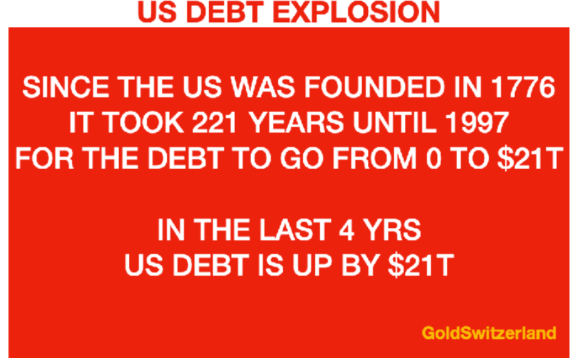 Let’s put this into perspective. It took the US 221 years to go from Zero debt in 1776 to $21 trillion in 1997 and just in the last 4 years, debt has gone up by that same $21 trillion.