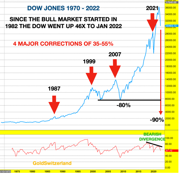 Another very important technical factor on this chart is the bearish divergence on the Relative Strength Index – RSI. Since 2018, I have pointed out that the RSI on this quarterly chart has made lower highs since 2018 as the Dow has made new highs. This is a very bearish signal and will inevitably result in a major fall of the Dow as we are now seeing.