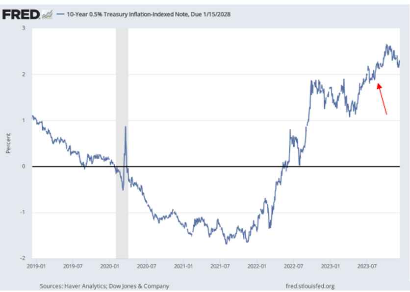 And when real rates approach 2%, this means debt becomes really painful for companies, individuals, and, of course, broke governments like the U.S.