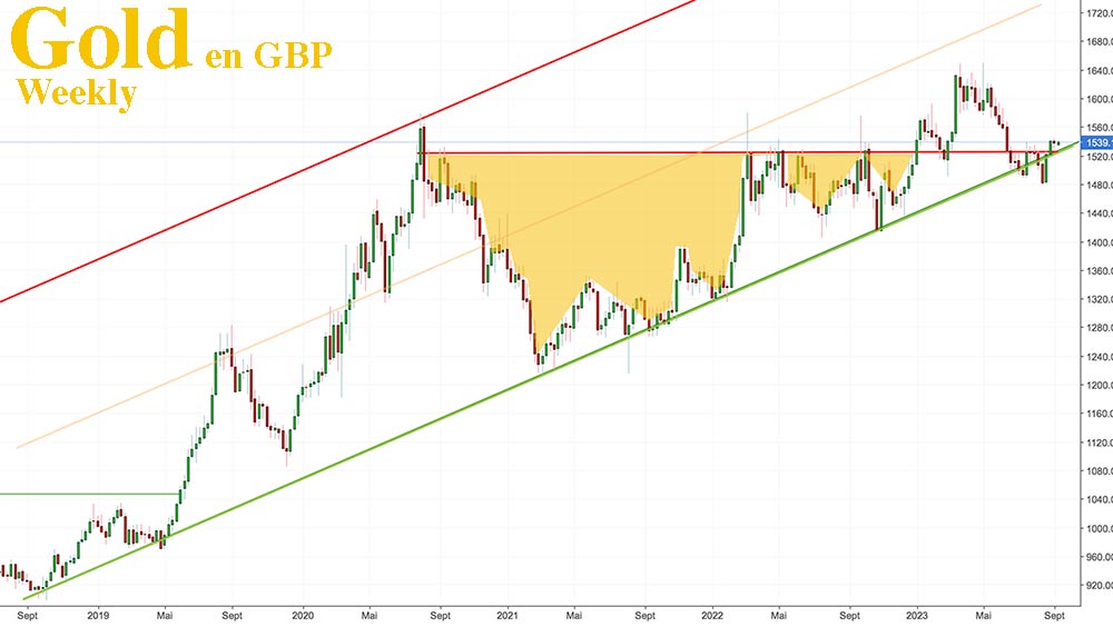After a nice upward surge at the end of August, the price of gold in euros formed a horizontal flag consolidation.