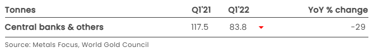 - Central bank gold demand in Q1 more than doubled q-o-q, but was 29% lower y-o-y