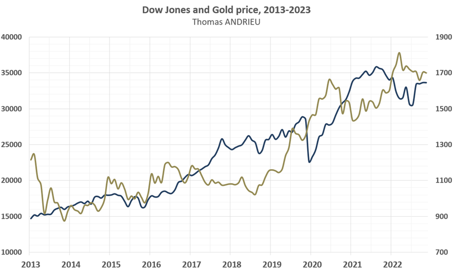 The final question that arises is whether there is a real link between the stock market and the price of gold. It appears that the price of gold is generally more dynamic during periods of stock market contraction. Although there is a correlation between gold and the stock market (in this case the Dow Jones), this link is not obvious.