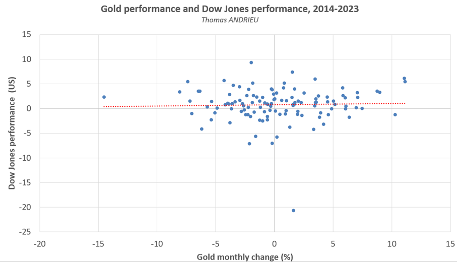 The above chart confirms that the performance of gold is not immediately linked to the performance of the stock market. It would obviously be pointless to point out that gold does not pay dividends. But we notice that where the performance of the stock market is strongly negative, gold is rather resilient.