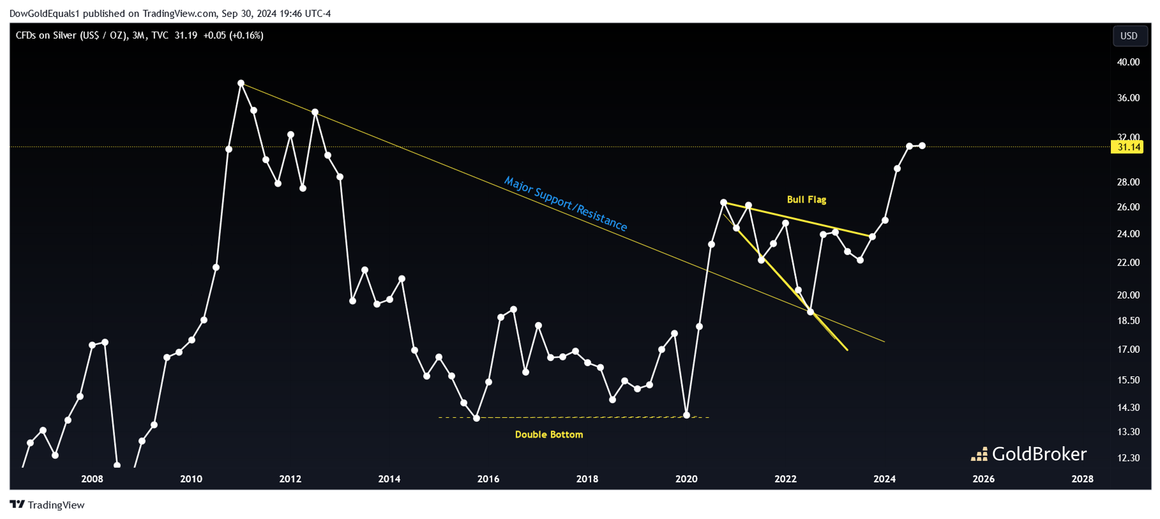 This week, we'll look at gold and silver and see that each are at some very interesting inflection points. Starting with silver, we see that it has just closed the quarter at $31.14, its highest close in 12 years and its 5tth highest quarterly close of all time! Silver is up about 65% off its quarterly low set in 2022 and shows little signs of slowing down. The next target of interest is its all time high quarterly close of $37.58, and should it be able to top that, there is very thin air above that.