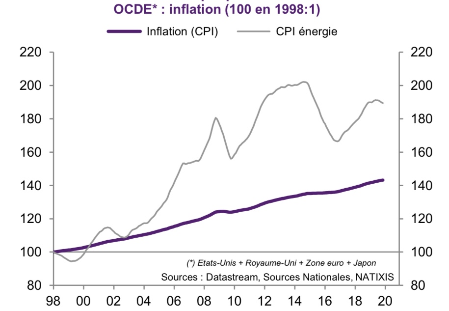And energy, we use it everywhere. As a result, the effect on the general price level will become inexorable. We have to add the restructuring costs borne by fossil fuel-related sectors, such as the automobile industry, the migration from oil-fired heating to electricity, and so on. That is what could restart inflation, at least in Europe, because the United States, as we know, left the Paris Agreement on Climate Change and does not hesitate to use fossil fuels, while China does not give a damn about its CO2 emissions. A price increase that is only localized in Europe would have even more destructive effects (loss of competitiveness, lower purchasing power, risk of recession).
