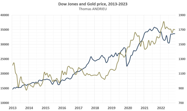 It's also worth noting that the monthly correlation between gold and the S&P 500, for example, is +71% between 2003 and 2023. But then again, there is almost no correlation between the variations of the two assets. The chart below illustrates, for example, the comparative level of the gold price and that of the Dow Jones. Consequently, one could just as easily argue that there is a correlation between gold and real rates, as between the stock market and gold.