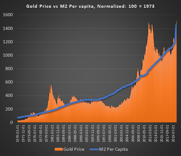 By default, I like to normalize it to 100 in 1973 or 1995, and track the relative growth from there, which result in roughly the same number regardless of which of those two dates are chosen. I choose 1973 because that was shortly after gold was decoupled from the dollar, and therefore gave the market time to adjust gold to a reasonable price. And I choose 1995 because it was a perfectly boring time, without crises, housing bubbles, stock bubbles, excessive money-printing, and so forth.