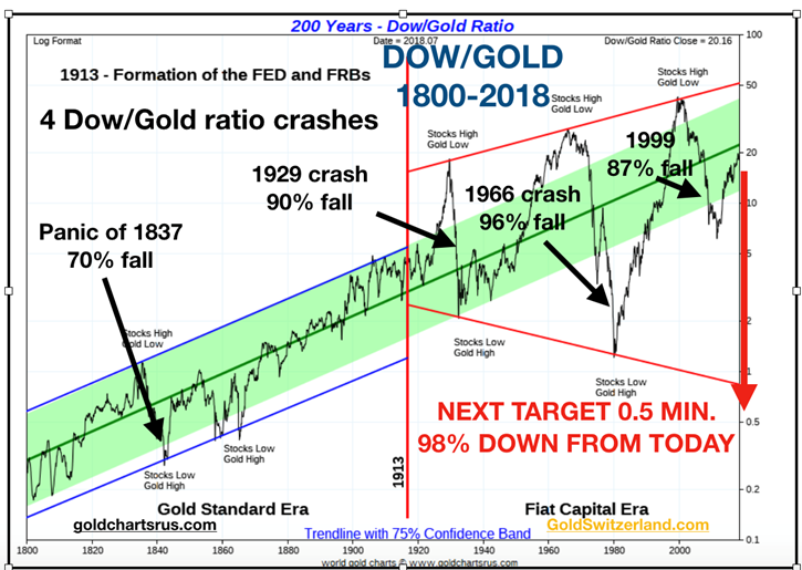 The next decline of the Dow/Gold ratio is likely to reach 1/2 (see chart above) which means a further fall of 98% from here. If that is correct, Alfred will lose 98% of his stock portfolio in real terms which is against gold. Thus 74 years of substantial savings could all disappear in the next 4-6 years. This forecast might seem dramatic, but we must remember (as the graph shows) that since the Fiat money era started in 1913, there have been three major declines between 87% and 96%. And this was during times when the preceding credit expansion was much smaller than today. So a 98% fall from here is certainly not unrealistic.