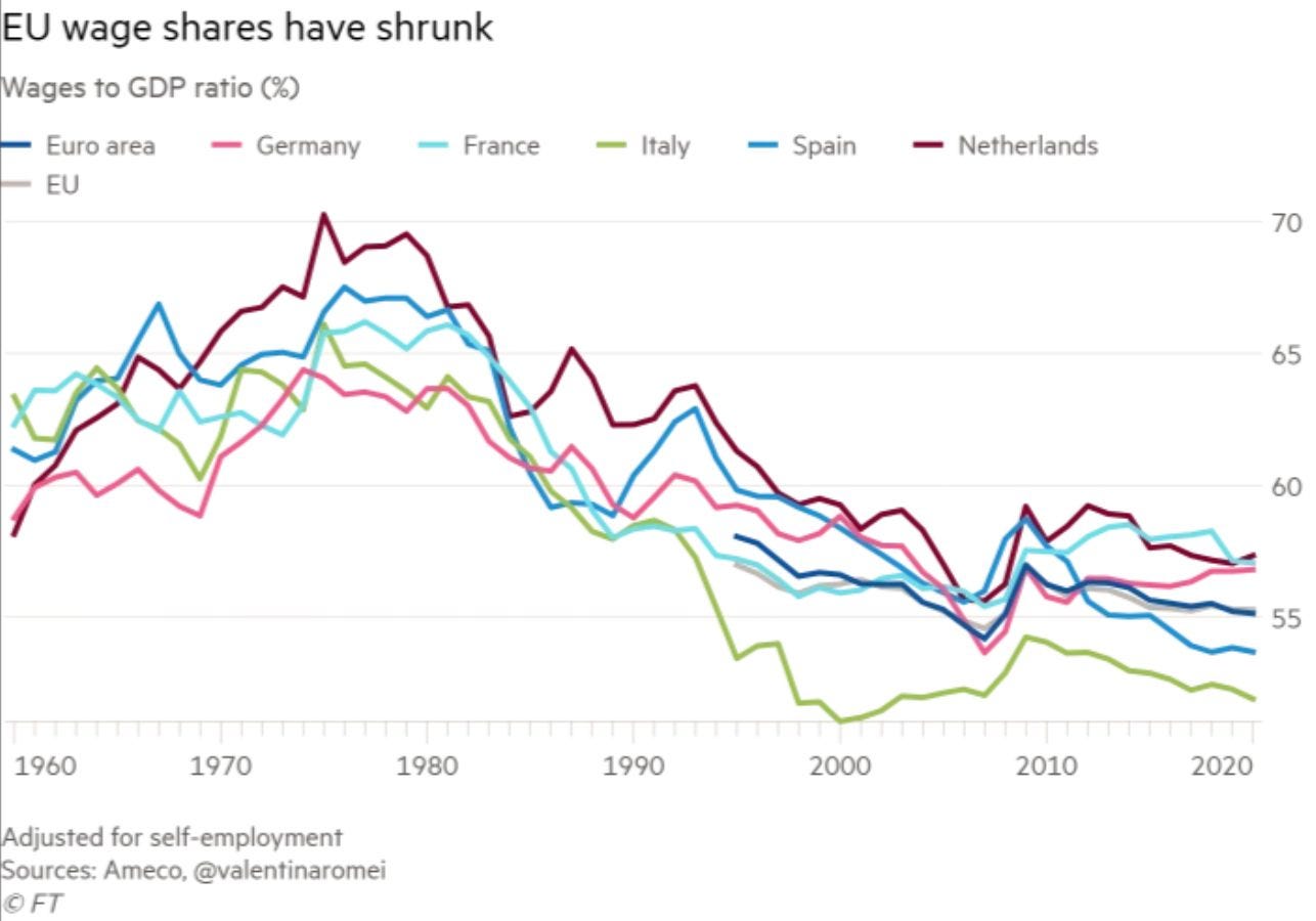 The share of wages in GDP has been falling steadily over the past few years, and the enrichment effect of rising equity markets is affecting only one in ten European households. Meanwhile, wage earners are getting poorer, and their savings are declining in real terms due to inflation: