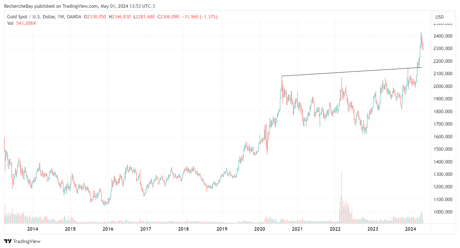 The fact that the price of gold remains above its break line is a signal that the Fed will not be able to keep rates at this level for very long without jeopardizing the refinancing of US debt.