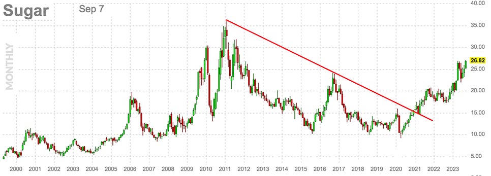 Sugar reacts in parallel to energy prices. It took off in the early 1970s (see the film “Sugar”), forming a speculative bubble, followed by money and the first oil shock. With each surge in money, sugar takes off before its time and makes a bullish rally: 2006 - 2011 - 2016... 2023?