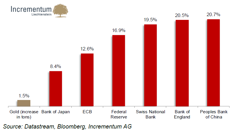 The global picture is in no better shape. The balance sheets of all the central banks (charts #13 and #14) are also in bad shape. This makes many believe that we will not have just a US dollar collapse, but a collapse of the entire fiat currency system, which has today at its core the US dollar. All currencies are linked in one way or another to the US dollar, and none are linked to gold.