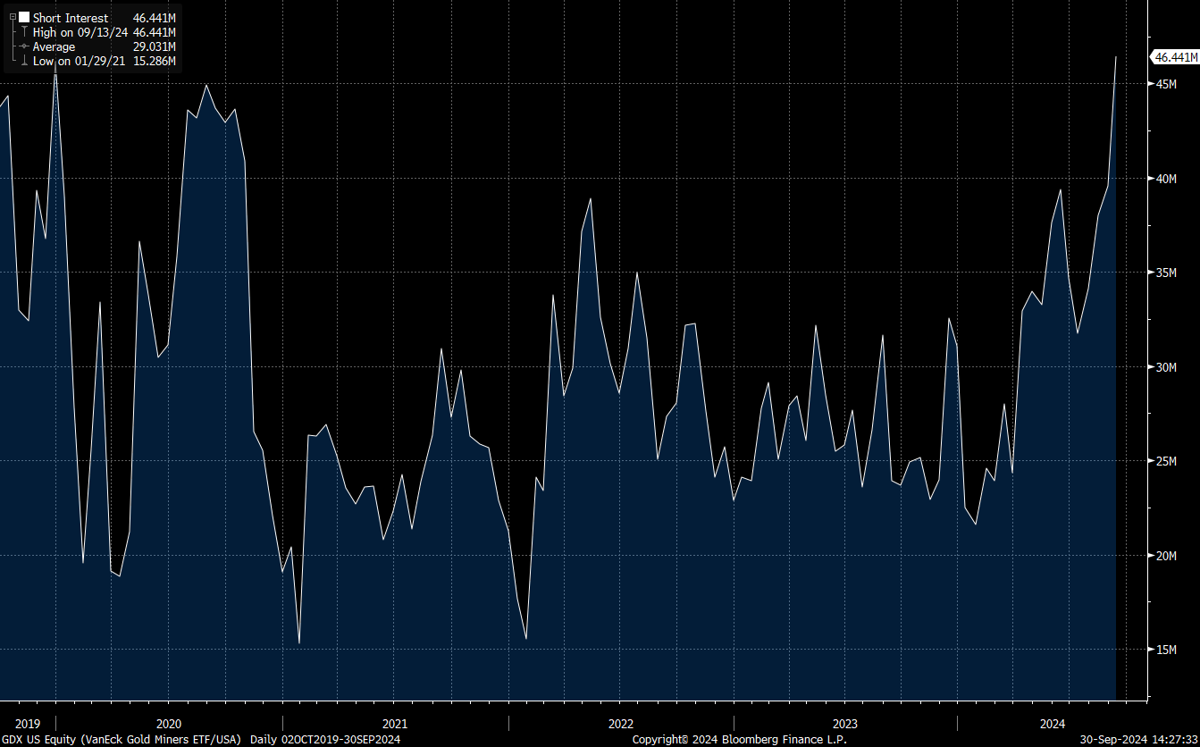 Short positions in mining stocks also increased. At the end of September, the number of short positions on the GDX index reached a 4-year high: