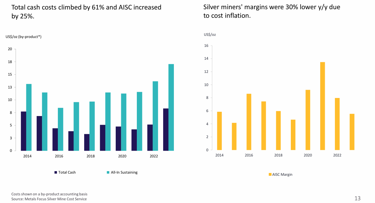 Over one year, the total production cost of an ounce of silver (AISC) climbed 25% to nearly $18. As for total cash costs, they rose by over 60% in 2023! Conversely, the profitability of silver mining companies has plummeted. The margin generated by mining companies in 2023 will barely exceed $5 per ounce of silver... A level almost as low as in 2019 or 2015!... We note that such low margins on the silver market have often preceded a significant upward movement in the price of the grey metal (+17.5% in 2016 and +47% in 2020). Rising production costs are thus characteristic of the future persistence of bull markets in precious metals.