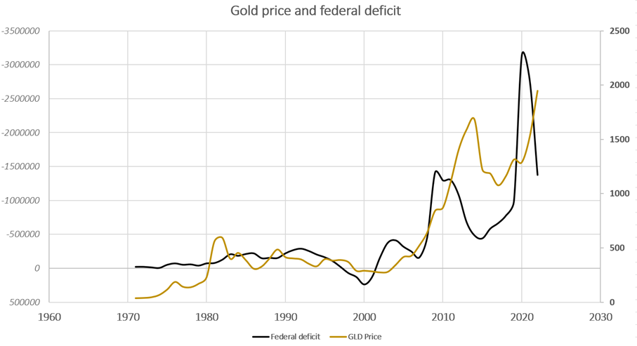 Moreover, we notice a more or less direct link between the evolution of the gold price and the public deficits. The graph above compares the price of gold (yellow curve) with the inverted US federal deficit (black curve). The more the deficit increases, the more gold rises. In fact, the rise in the U.S. federal deficit is the most common predictor of gold's rise. As the gold price data stops in 2021, we can see that the decline in the deficit in 2021 was indeed accompanied by a relative correction in gold in 2022.