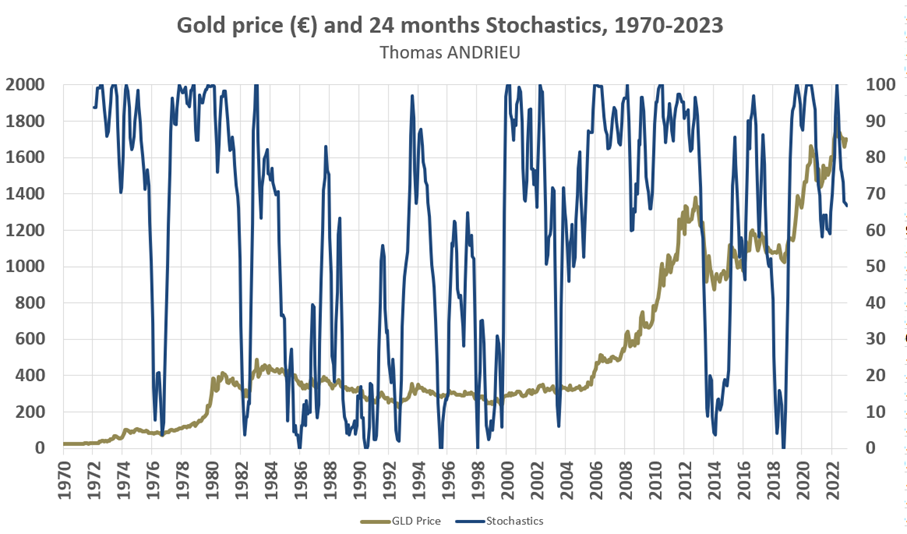 In addition, we have used stochastics to highlight the buying zones in a clear way. The buying zones on the gold price (in dollars) are often repeated every six to nine years (two to three Kitchin cycles). Stochastics remains a reliable way, and with a one-time calculation, to highlight interesting periodicities.