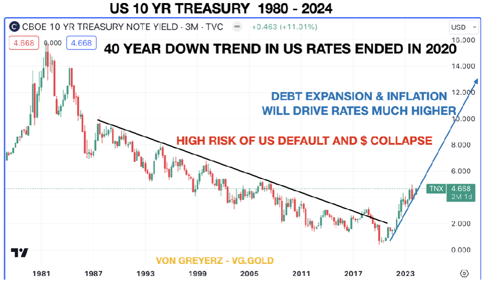 I have discussed this in many articles as well as in for example this interview from 2022 when I stated that rates will exceed 10% and potentially much higher in the coming inflationary environment, fuelled by escalating deficits and debt explosion.