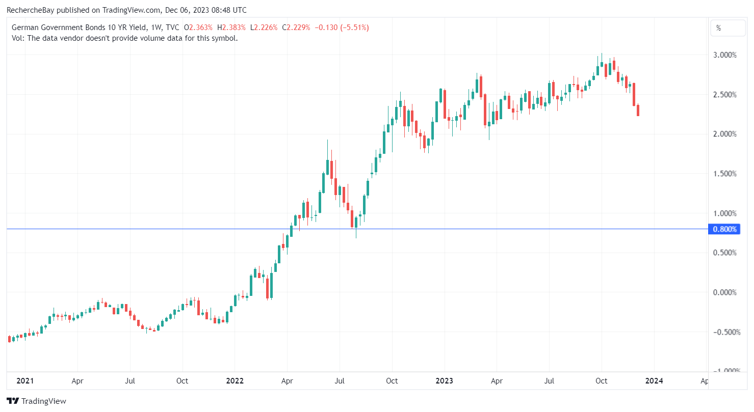 German yields began to fall in response to these disappointing indicators. The German 10-year yield, which was close to 3% in October, has already fallen back to around 2%: