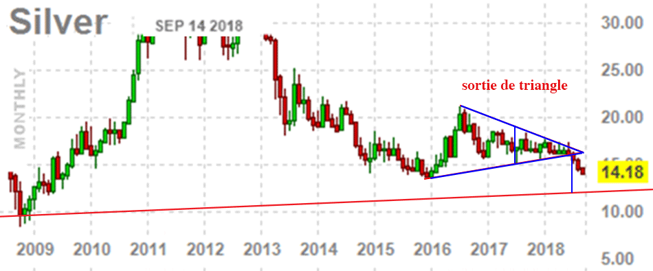 On the chart underneath, you can see that silver had been tightly closed in a triangle since 2016. We were hoping that prices will get out of this triangle upwards, but it went downwards.