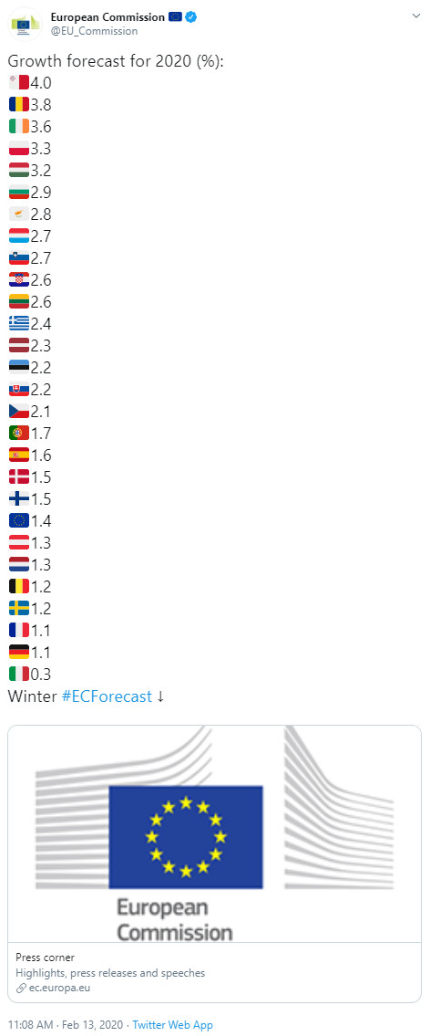 This observation is still very relevant as the European Commission has just announced its growth forecasts for 2020. On February 13, Brussels was forecasting an average of 1.4% for 2020, the same level of growth as England, according to the IMF. Emmanuel Macron will therefore have a hard time showing off in front of Boris Johnson since only our German and Italian neighbours will in principle do worse than us: